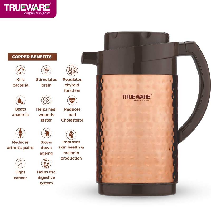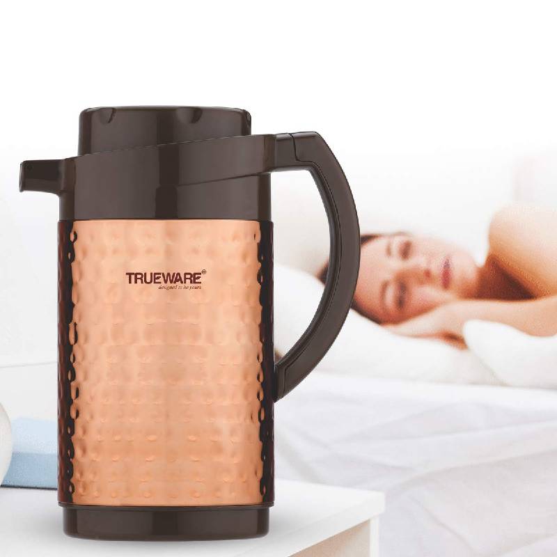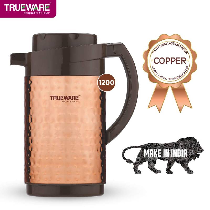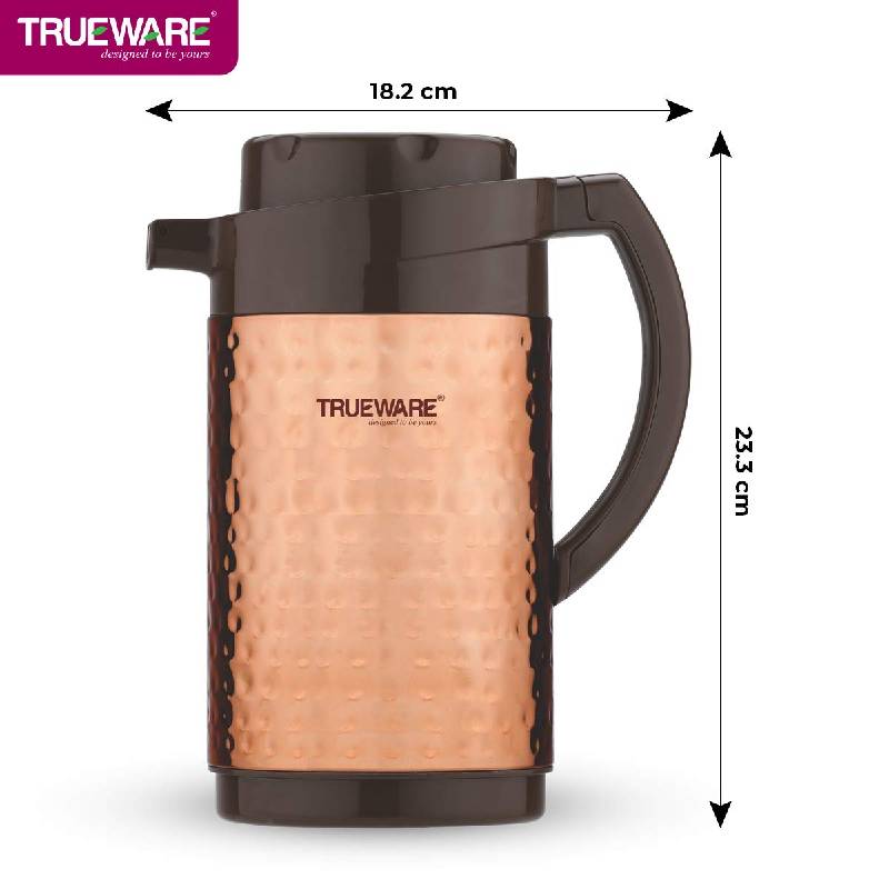 Trueware Thrush 1200 Insulated Flask - 1000 Ml | Insulated Tea Pot Kettle Thermos Water Jug | Hot & Cold | Leak-Proof Lid | Thermoware | Food Grade Plastic | 100% Stainless Steel | Lightweight BPA-Free | Wide Mouth Design | Ideal for Office, Travel | Copper Hammered Finish